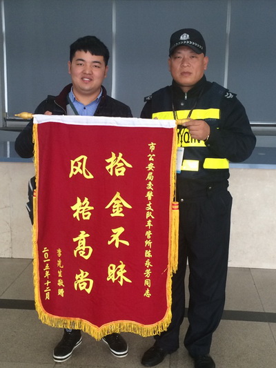 12月23日,安徽籍市民李先生手捧寫(xiě)有“拾金不昧 風(fēng)格高尚”的錦旗專(zhuān)程來(lái)到溫州市車(chē)管所,對保安隊長(cháng)陳永芳撿到錢(qián)包并主動(dòng)歸還的舉動(dòng)表示感謝。 事發(fā)當日早上6點(diǎn)多,溫州市保安服務(wù)總公司派駐車(chē)管所保安中隊隊長(cháng)陳永芳,在上班途中經(jīng)過(guò)雙嶼天橋下時(shí)撿到一個(gè)錢(qián)包,發(fā)現里面有現金若干,銀行卡、身份證等各類(lèi)重要證件,他在原地等了半小時(shí)后也不見(jiàn)有人過(guò)來(lái)詢(xún)問(wèn),就先回到單位里上班,并通過(guò)多方面渠道終于聯(lián)系到失主,原來(lái)失主是一名在溫州開(kāi)出租車(chē)的司機。當李先生接過(guò)失而復得的錢(qián)包時(shí)感動(dòng)萬(wàn)分,連聲稱(chēng)贊車(chē)管所保安員品德高尚,急忙拿出500元錢(qián)表達謝意,不過(guò)被陳永芳隊長(cháng)婉言謝絕了,這才出現了本文的開(kāi)頭的一幕。 五大隊:?jiǎn)物@綠 |