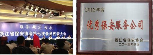 2013年8月8日,浙江省保安協(xié)會(huì )第七次會(huì )員代表大會(huì )在杭州勝利召開(kāi),公司榮獲“浙江省優(yōu)秀保安服務(wù)公司”榮譽(yù)稱(chēng)號,并被評為浙江省保安協(xié)會(huì )第七屆理事會(huì )常務(wù)理事單位,公司總經(jīng)理汪榮耀當選為浙江省保安協(xié)會(huì )第七屆理事會(huì )常務(wù)理事。 近年來(lái),總公司在市局黨委的領(lǐng)導下,在社會(huì )各界朋友的關(guān)心、幫助和支持下,在公司領(lǐng)導的正確帶領(lǐng)下,經(jīng)過(guò)全體員工的團結奮戰,共同努力,抓市場(chǎng)發(fā)展的良好機遇,深化企業(yè)內部改革,努力提高保安服務(wù)水平和管理質(zhì)量,總公司在隊伍管理、業(yè)務(wù)拓展、品牌創(chuàng )建等方面都取得了進(jìn)步,圓滿(mǎn)完成了各項工作指標任務(wù),取得了良好的社會(huì )效益與經(jīng)濟效益,為溫州的平安和諧做出了貢獻。
